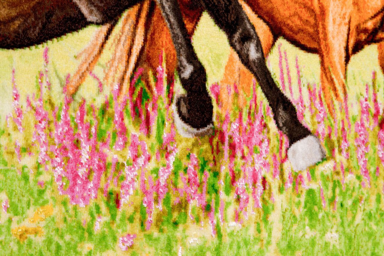 Capture the spirit of untamed nature with this stunning handwoven silk carpet tableau, featuring three majestic horses galloping through a lush meadow of wildflowers. The dynamic composition and lifelike detailing bring this scene of freedom and power to life, making it a perfect statement piece for any space. The vibrant greens of the meadow and the rich tones of the horses blend seamlessly, evoking a sense of vitality and natural beauty.